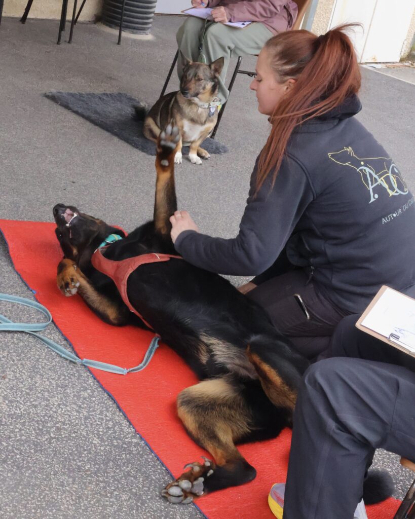 Ce mercredi 1er avril 2026, j’ai pu proposer un petit moment de douceur et de partage aux membres de l’association Autour Du Chien 43. Lors de cet atelier « Mobilité et Bien-être du chien » destiné à des petits groupes, on voit quelques bases de l’anatomie canine, on fait des repérages sur son chien avant de passer à la routine massages et stretching. Pour finir, on fait un point sur le harnais de chacun pour voir s’il est adapté. Merci aux organisateurs pour leur accueil et aux 12 binômes participants de cette première session d’ateliers pour leur enthousiasme !